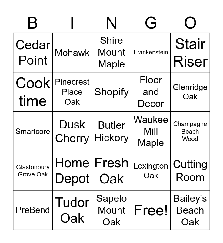 This bingo card has 30 words: Tudor Oak, Sterling Oak, Dusk Cherry, Sundance Canyon Hickory, Cedar Point, Shire Mount Maple, Pinecrest Place Oak, Fresh Oak, Waukee Mill Maple, Sapelo Mount Oak, Champagne Beach Wood, Butler Hickory, Free!, Bailey's Beach Oak, Glenridge Oak, Gunstock Oak, Lexington Oak, Glastonbury Grove Oak, Home Depot, Stair Riser, Smartcore, Lifeproof, Mohawk, Floor and Decor, Cook time, Frankenstein, Cutting Room, PreBend, Shopify and Bullnose.