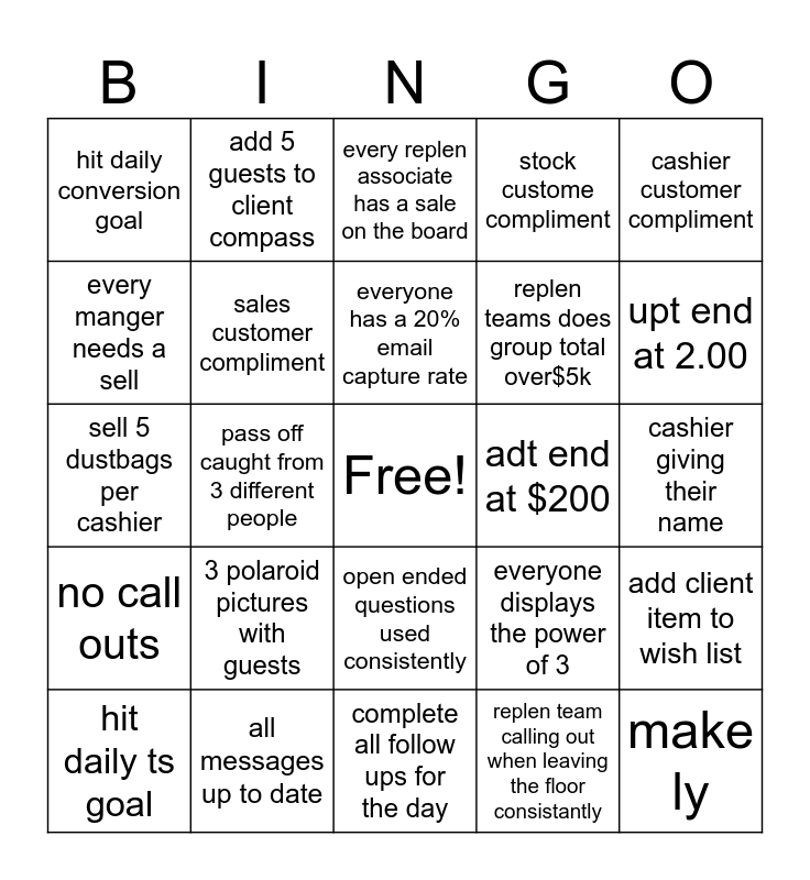 This bingo card has a free space and 24 words: 3 polaroid pictures with guests, all messages up to date, everyone has a 20% email capture rate, hit daily ts goal, cashier customer compliment, hit daily conversion goal, every manger needs a sell, add 5 guests to client compass, adt end at $200, open ended questions used consistently, replen teams does group total over$5k, sell 5 dustbags per cashier, everyone displays the power of 3, add client item to wish list, sales customer compliment, replen team calling out when leaving the floor consistantly, cashier giving their name, every replen associate has a sale on the board, upt end at 2.00, pass off caught from 3 different people, make ly, no call outs, stock custome compliment and complete all follow ups for the day.