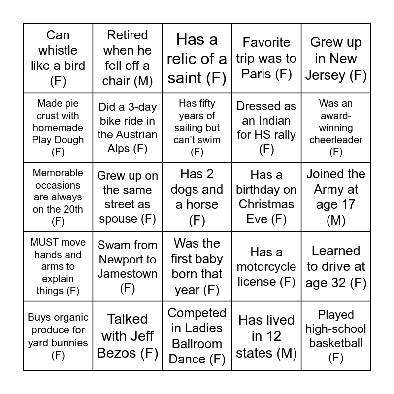 This bingo card has 55 words: Free!, Buys organic produce for yard bunnies (F), Can play 10 different instruments (F), Can whistle like a bird (F), Competed in Ladies Ballroom Dance (F), Currently taking piano lessons and singing in public (M), Did a 3-day bike ride in the Austrian Alps (F), Doesn’t like candles or matches (F), Dressed as an Indian for HS rally (F), Enjoys sewing (M), Favorite trip was to Paris (F), Fell through the ice as a child (F), 1st concert was Chicago / Beach Boys (F), 1st concert was Whitney Houston at PPAC (M), 1st in line for the restroom with BVD’s on backwards (M), Gave up a pilot’s license for a handsome man (F), Grew up in New Jersey (F), Grew up on the same street as spouse (F), Had lunch with Richard Gere (F), Has 2 dogs and a horse (F), Has a birthday on Christmas Eve (F), Has a dove tattoo on right shoulder (F), Has a motorcycle license (F), Has a relic of a saint (F), Has an adopted son (M), Has fifty years of sailing but can’t swim (F), Has lived in 12 states (M), Has lived in 7 states (F), Joined the Army at age 17 (M), Learned to drive at age 32 (F), Likes to play games (F), Likes to twirl her hair (F), Loves IPA (beer) (F), Made a nun faint in 7th grade (M), Made pie crust with homemade Play Dough (F), Memorable occasions are always on the 20th (F), Met spouse on a blind date (F), MUST move hands and arms to explain things (F), Played high-school basketball (F), Received a nursing degree at age 39 (F), Retired when he fell off a chair (M), Sailed to the Bahamas at age 23 (F), Sang in a choir for 12 years (F), Skipped work for a Grateful Dead concert (F), Swam from Newport to Jamestown (F), Talked with Jeff Bezos (F), Took 4 years of Russian (F), Took dancing lessons at age 18 (F), Walked around school building on the windowsills (M), Was an award-winning cheerleader (F), Was born in Germany (F), Was rear-ended by a police cruiser! (F), Was read Miranda Rights as a “Drug Queen” (F), Was the first baby born that year (F) and Won 1st place in a shooting contest (F).