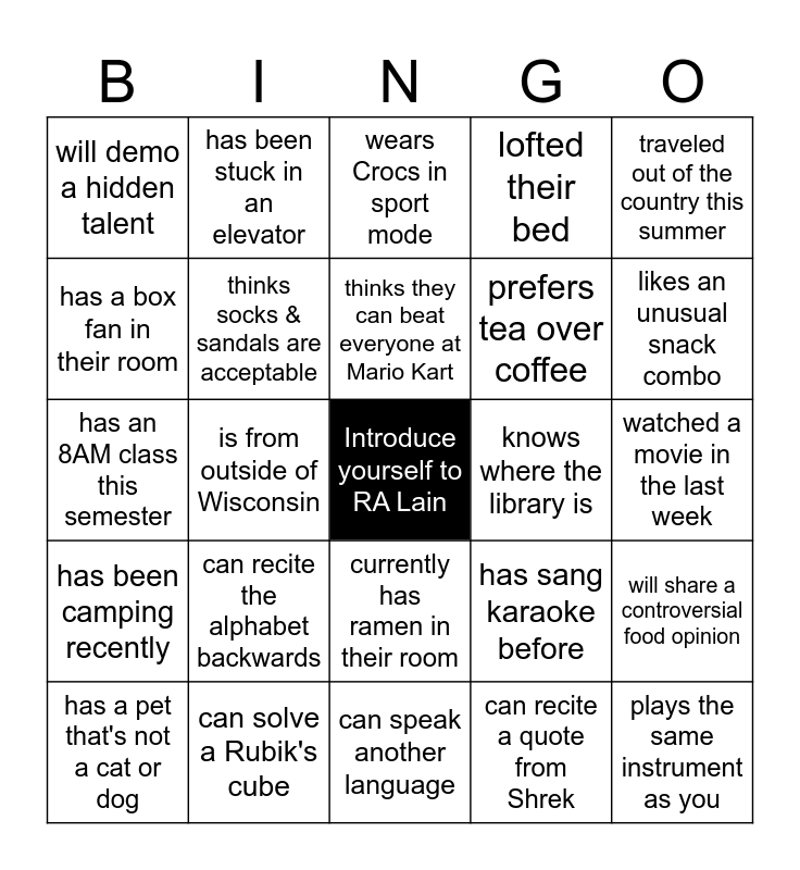 This bingo card has a free space and 29 words: has a pet that's not a cat or dog, has the same major, is from outside of Wisconsin, shares a birthday month, will demo a hidden talent, wears Crocs in sport mode, thinks socks & sandals are acceptable, can recite the alphabet backwards, knows where the library is, can solve a Rubik's cube, watched a movie in the last week, plays the same instrument as you, can speak another language, can recite a quote from Shrek, likes an unusual snack combo, knows one of their professor's names, currently has ramen in their room, has been camping recently, traveled out of the country this summer, has an 8AM class this semester, has sang karaoke before, went to a concert this summer, prefers tea over coffee, has a box fan in their room, lofted their bed, has been stuck in an elevator, will share a controversial food opinion, thinks they can beat everyone at Mario Kart and plans to go to the first football game this season.