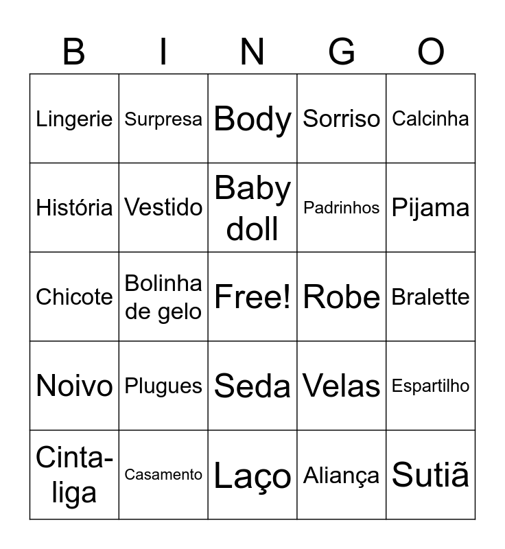 This bingo card has a free space and 58 words: Amor, Casamento, Noiva, Noivo, Aliança, Buquê, Vestido, Madrinhas, Padrinhos, Felicidade, Sorriso, Família, Romance, Flores, Presente, Lingerie, Sutiã, Calcinha, Camisola, Baby doll, Robe, Body, Cinta-liga, Espartilho, Fio dental, Bralette, Top, Corpete, Pijama, Short doll, Modelador, Strapless, Tomara que caia, Meia-calça, Meia arrastão, Algemas, Máscara, Bolinha de gelo, Chicote, Gel de massagem, Plugues, Fantasia, Velas, Luvas, Mordaça, Cinta para amarrar, Massageador, Seda, Laço, Coração, Lua de mel, Dança, Música, Beijo, Surpresa, Companheirismo, História and Felizes.