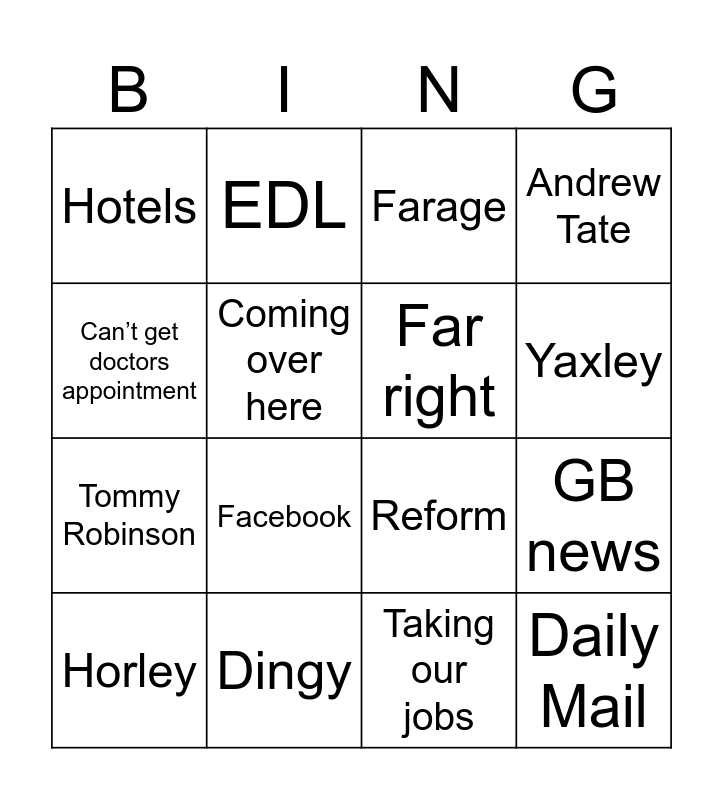 This bingo card has 16 words: Dingy, GB news, Farage, Hotels, Tommy Robinson, EDL, Reform, Taking our jobs, Can’t get doctors appointment, Coming over here, Horley, Andrew Tate, Facebook, Yaxley, Far right and Daily Mail.