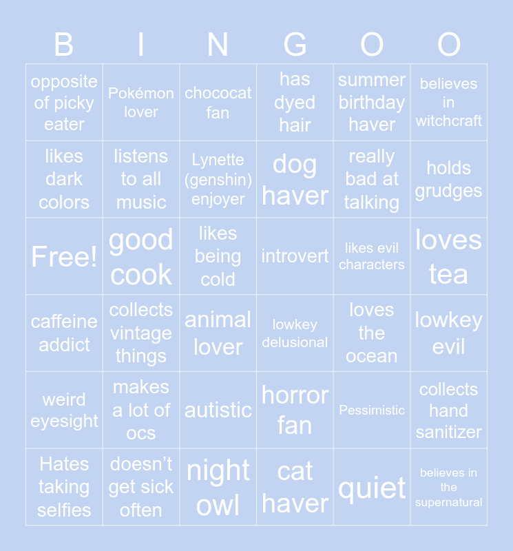 This bingo card has 36 words: horror fan, autistic, cat haver, likes dark colors, caffeine addict, introvert, listens to all music, night owl, summer birthday haver, Pessimistic, holds grudges, has dyed hair, collects hand sanitizer, good cook, dog haver, opposite of picky eater, weird eyesight, likes evil characters, Free!, chococat fan, likes being cold, collects vintage things, lowkey delusional, animal lover, loves the ocean, Pokémon lover, really bad at talking, doesn’t get sick often, Lynette (genshin) enjoyer, believes in witchcraft, believes in the supernatural, Hates taking selfies, lowkey evil, loves tea, makes a lot of ocs and quiet.