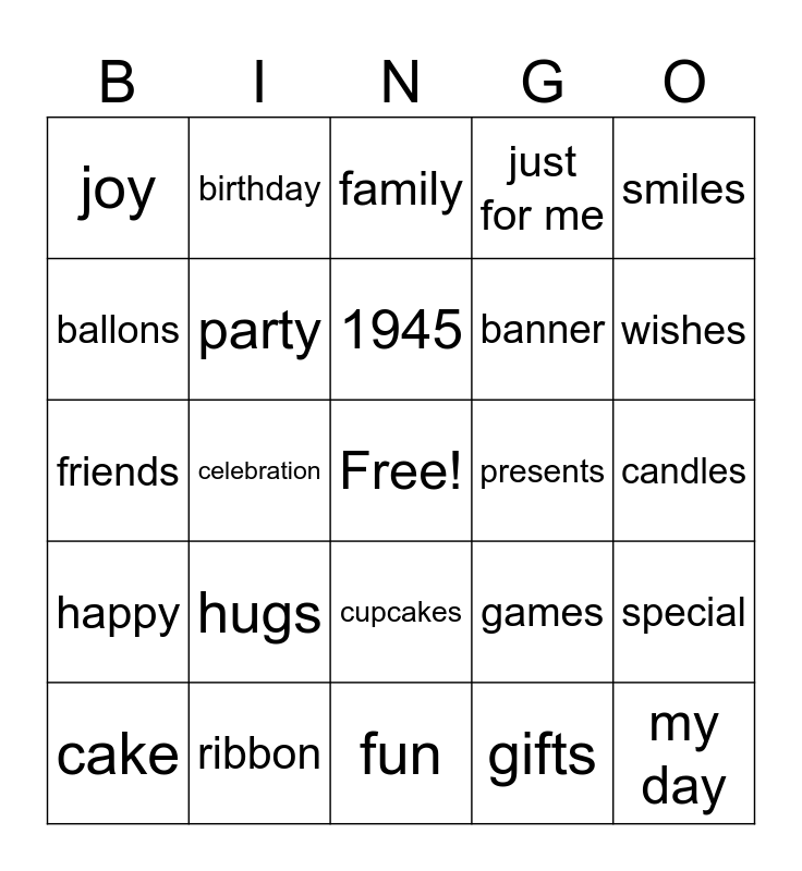 This bingo card has a free space and 29 words: cake, happy, celebration, carol, joy, family, party, hugs, presents, ribbon, candles, my day, fun, gifts, wishes, 80, cupcakes, happy, smiles, friends, games, food, banner, ballons, just for me, birthday, special, 1945 and laughter.