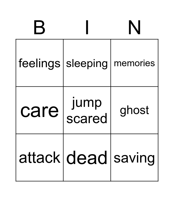 This bingo card has a free space and 8 words: ghost, memories, sleeping, attack, feelings, saving, care and dead.
