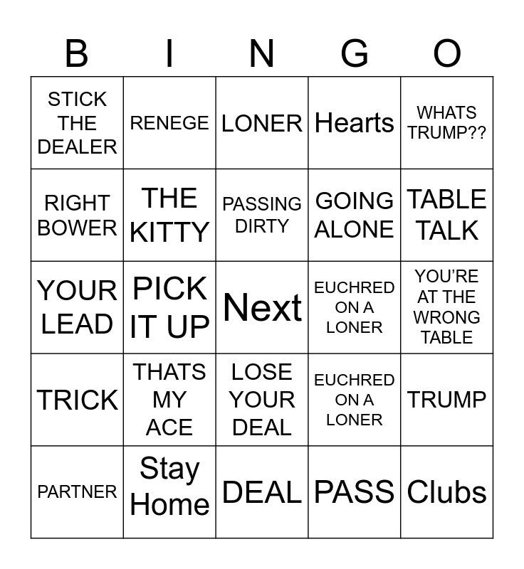 This bingo card has a free space and 28 words: TRUMP, LEFT BOWER, GOING ALONE, PASS, RIGHT BOWER, LONER, RENEGE, TRICK, EUCHRED ON A LONER, PARTNER, YOUR LEAD, Hearts, Stay Home, DEAL, TABLE TALK, FIRST JACK, THATS MY ACE, THE KITTY, PASSING DIRTY, LOSE YOUR DEAL, STICK THE DEALER, JACKS, Clubs, PICK IT UP, YOU’RE AT THE WRONG TABLE, EUCHRED ON A LONER, WHATS TRUMP?? and YOUR DEAL.