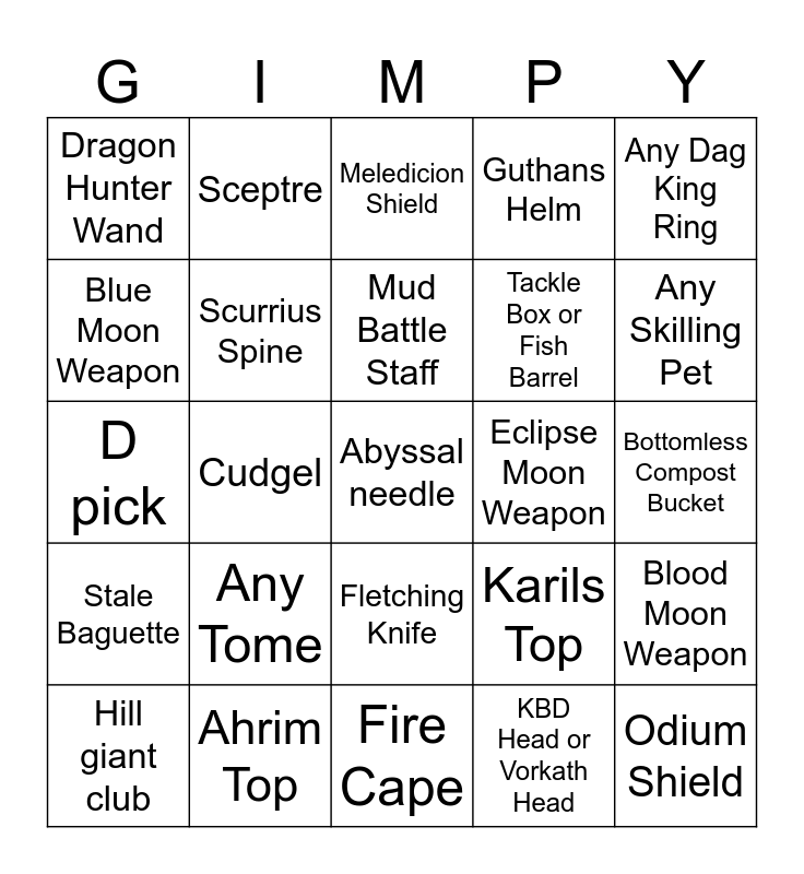This bingo card has 25 words: Any Tome, Fire Cape, Mud Battle Staff, Hill giant club, Any Dag King Ring, Dragon Hunter Wand, Blue Moon Weapon, Sceptre, Eclipse Moon Weapon, Fletching Knife, Tackle Box or Fish Barrel, D pick, Karils Top, Blood Moon Weapon, Scurrius Spine, Odium Shield, Bottomless Compost Bucket, Meledicion Shield, Any Skilling Pet, Cudgel, Abyssal needle, Ahrim Top, Stale Baguette, Guthans Helm and KBD Head or Vorkath Head.