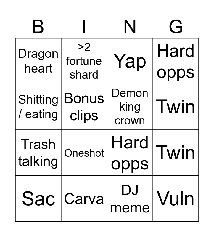 This bingo card has 19 words: Hard opps, Try hard, Yap, Vuln, Twin, Shitting / eating, DJ meme, Dragon heart, >2 fortune shard, Trash talking, Oneshot, Bonus clips, Demon king crown, Carva, Sac, >100k dame, Hard opps, Twin and Shitting / eating.
