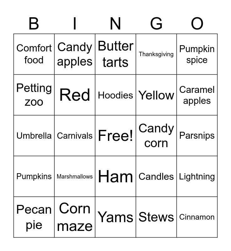 This bingo card has a free space and 62 words: Apples, Corn maze, Apple pie, Pumpkins, Pumpkin pie, Turkey, Red, Brown, Yellow, Falling leaves, Thanksgiving, Pumpkin patch, Petting zoo, Hayride, Soup, Comfort food, Cinnamon, Pumpkin spice, Daylight savings, Hoodies, Candy corn, Butter tarts, Pecan pie, Stews, Storms, Rain, Boots, Thunder, Lightning, Plaid, Flannel, Brussel sprouts, Cabbage, Beets, Parsnips, Candy apples, Squash, Farmer markets, Carnivals, Raincoat, Umbrella, Fire pits, Marshmallows, Caramel, Caramel apples, Candles, Hot cocoa, Snails, Slugs, Spiders, Ham, Yams, Turnips, Gatherings, Gilmore girls, October sky, Movie nights, Harvest, Wind storms, Cider, Books and Football.