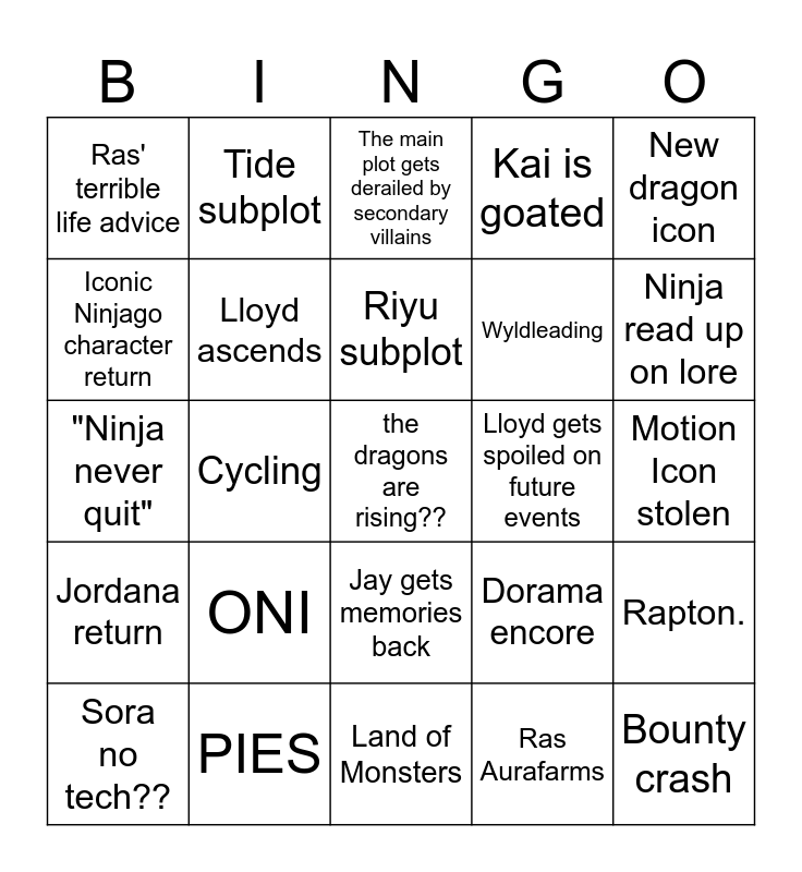 This bingo card has a free space and 67 words: Zane pain, Cole doesn't get sidelined?, Ras' Master reveal?, Rapton., Administrating, CHIMA, Tide subplot, Beatrix return, Riyu subplot, Unshattered Jay, Jay gets memories back, Meeting a Source, Motion Icon stolen, New dragon icon, set shoehorned, Iconic Ninjago character return, Cycling, Ras' terrible life advice, (Ras at) Shadow Dojo???, Wyldleading, ONI, Jordana return, Kai is goated, Ras Aurafarms, Lloyd is suffering, Wu escapes Ras, Why Wu did merge?, The writers remembered Cinder!, Ninja read up on lore, Nadakhan reference?, Bounty crash, GARMADON, Morro, Death., New Monastery, Sora no tech??, Ninjago callbacks, Dorama encore, "Ninja never quit", Intelligent George has intel, Ras ascends, Lloyd ascends, Lloyd gets spoiled on future events, Arrakore, Euphrasia, Cole ditches the ninja to meet with his trash family <3, Never say Never (realm), PIES, Balance, ToS Elemental masters return, The main plot gets derailed by secondary villains, Ras needs the vet, Synchronised fashion sense, Brickheroes is the template, Zarkar, Land of Monsters, Zeatrix return, Riyu is a growing boy, Arc dragon, Frakrushing on Sora, When that one ninja doesn't get the group memo about the new suits, Awaking an ancient evil, Alpha wolves never leave their clan, We must collect the things, Zane and PIXAL's honeymoon ends prematurely, Vengestone and A SICK FIGHT.