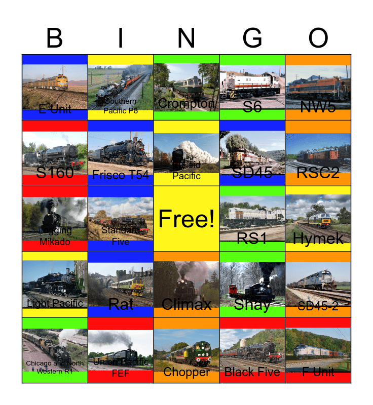 This bingo card has 24 images, a free space and 24 words: Rat, Union Pacific FEF, Bulleid Pacific, Chicago and North Western R1, NW5, E Unit, S160, Southern Pacific P8, RS1, Climax, SD45, Logging Mikado, Shay, SD45-2, Frisco T54, Black Five, Hymek, Crompton, RSC2, Standard Five, F Unit, Light Pacific, S6 and Chopper.