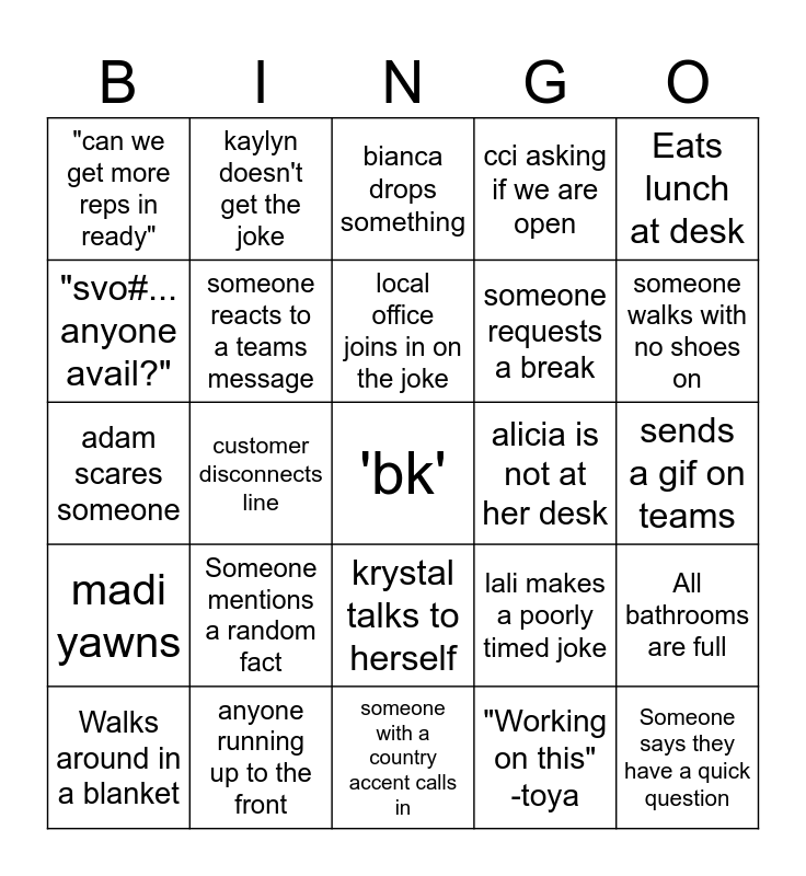 This bingo card has a free space and 24 words: Walks around in a blanket, Someone mentions a random fact, local office joins in on the joke, "Working on this" -toya, Eats lunch at desk, "can we get more reps in ready", kaylyn doesn't get the joke, bianca drops something, alicia is not at her desk, sends a gif on teams, adam scares someone, someone reacts to a teams message, lali makes a poorly timed joke, All bathrooms are full, "svo#... anyone avail?", anyone running up to the front, someone with a country accent calls in, cci asking if we are open, someone walks with no shoes on, madi yawns, customer disconnects line, krystal talks to herself, someone requests a break and Someone says they have a quick question.
