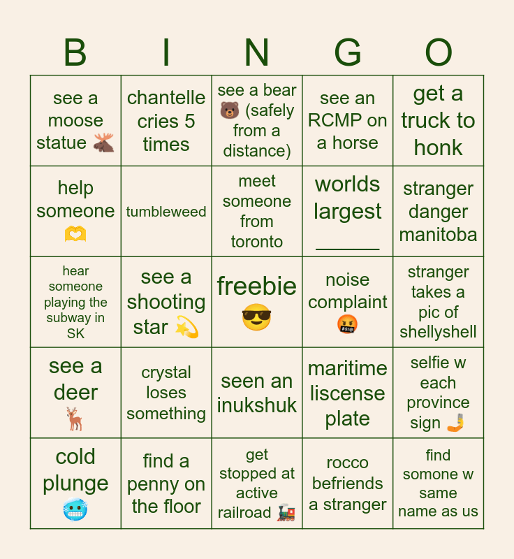 This bingo card has a free space and 24 words: crystal loses something, find a penny on the floor, meet someone from toronto, cold plunge 🥶, get a truck to honk, see a moose statue 🫎, help someone 🫶, chantelle cries 5 times, noise complaint 🤬, seen an inukshuk, worlds largest _____, hear someone playing the subway in SK, maritime liscense plate, selfie w each province sign 🤳, tumbleweed, rocco befriends a stranger, stranger takes a pic of shellyshell, see a bear 🐻 (safely from a distance), stranger danger manitoba, see a shooting star 💫, find somone w same name as us, see a deer 🦌, see an RCMP on a horse and get stopped at active railroad 🚂.