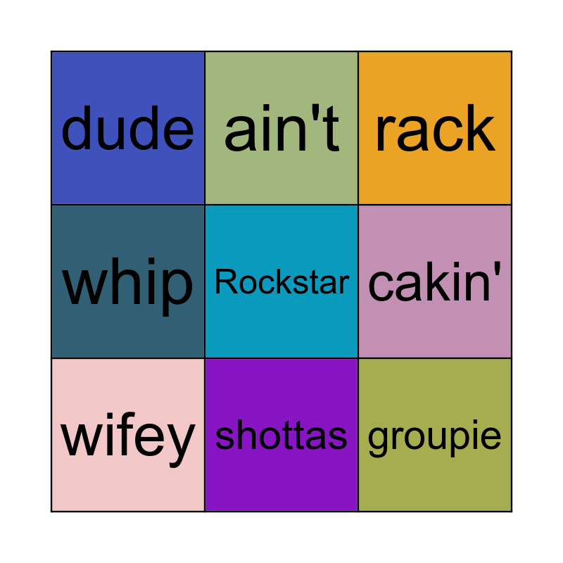 This bingo card has a free space and 8 words: cakin', rack, ain't, wifey, dude, groupie, whip and shottas.