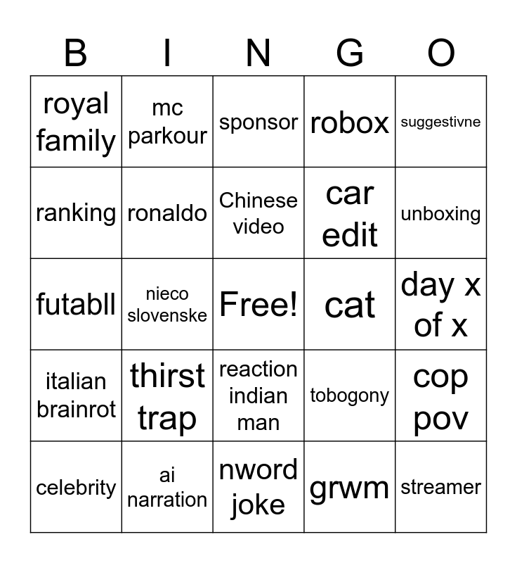 This bingo card has a free space and 24 words: thirst trap, ai narration, Chinese video, celebrity, suggestivne, royal family, ranking, mc parkour, cat, reaction indian man, car edit, futabll, tobogony, cop pov, ronaldo, grwm, day x of x, sponsor, unboxing, nieco slovenske, streamer, italian brainrot, robox and nword joke.