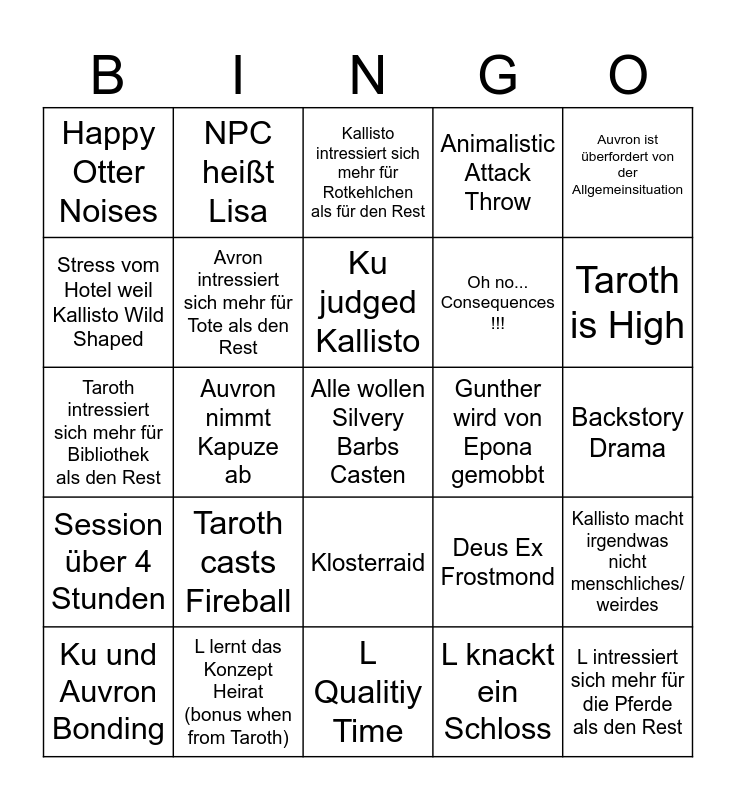 This bingo card has a free space and 24 words: Taroth casts Fireball, L lernt das Konzept Heirat (bonus when from Taroth), Ku judged Kallisto, Ku und Auvron Bonding, Auvron ist überfordert von der Allgemeinsituation, Happy Otter Noises, Stress vom Hotel weil Kallisto Wild Shaped, NPC heißt Lisa, Gunther wird von Epona gemobbt, Klosterraid, Oh no... Consequences !!!, Taroth intressiert sich mehr für Bibliothek als den Rest, Deus Ex Frostmond, Kallisto macht irgendwas nicht menschliches/ weirdes, Avron intressiert sich mehr für Tote als den Rest, L knackt ein Schloss, Backstory Drama, Kallisto intressiert sich mehr für Rotkehlchen als für den Rest, Taroth is High, Auvron nimmt Kapuze ab, L intressiert sich mehr für die Pferde als den Rest, Session über 4 Stunden, Animalistic Attack Throw and L Qualitiy Time.