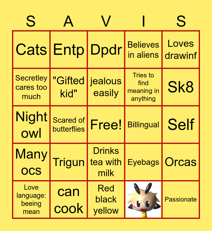 This bingo card has 1 images, a free space and 23 words: Trigun, can cook, jealous easily, Love language: beeing mean, Loves drawinf, Cats, Secretley cares too much, Entp, Billingual, Drinks tea with milk, Tries to find meaning in anything, Night owl, Eyebags, Orcas, "Gifted kid", Self, Dpdr, Sk8, Scared of butterflies, Passionate, Many ocs, Believes in aliens and Red black yellow.