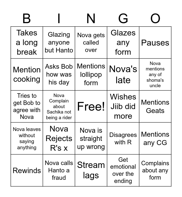 This bingo card has a free space and 24 words: Nova Rejects R's x, Nova calls Hanto a fraud, Mentions lollipop form, Rewinds, Pauses, Takes a long break, Mention cooking, Glazing anyone but Hanto, Wishes Jiib did more, Nova is straight up wrong, Nova's late, Tries to get Bob to agree with Nova, Disagrees with R, Mentions any CG, Asks Bob how was his day, Get emotional over the ending, Mentions Geats, Nova gets called over, Nova mentions any of shoma's uncle, Nova Complain about Sachika not being a rider, Complains about any form, Nova leaves without saying anything, Glazes any form and Stream lags.