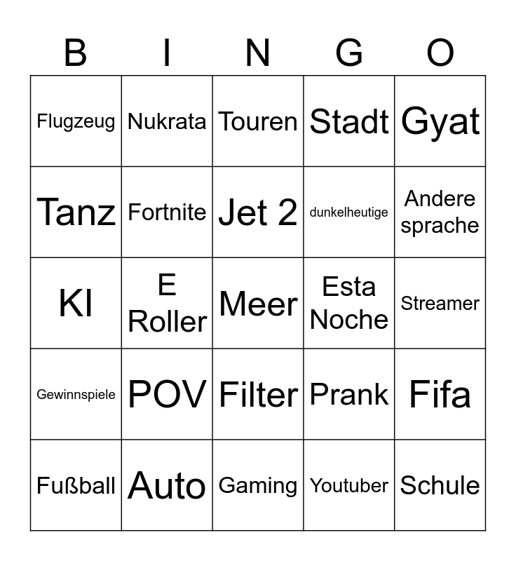 This bingo card has a free space and 24 words: POV, Auto, Jet 2, Fußball, Gyat, Flugzeug, Tanz, Nukrata, Esta Noche, Filter, dunkelheutige, KI, Prank, Fifa, Fortnite, Youtuber, Streamer, Touren, Andere sprache, E Roller, Schule, Gewinnspiele, Stadt and Gaming.