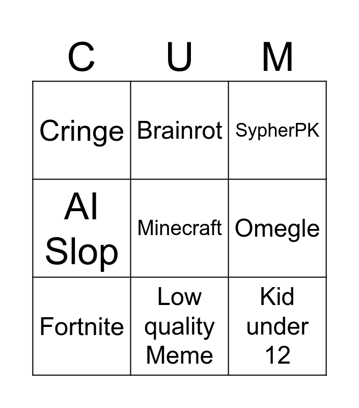 This bingo card has 9 words: Fortnite, SypherPK, Brainrot, AI Slop, Cringe, Omegle, Minecraft, Kid under 12 and Low quality Meme.