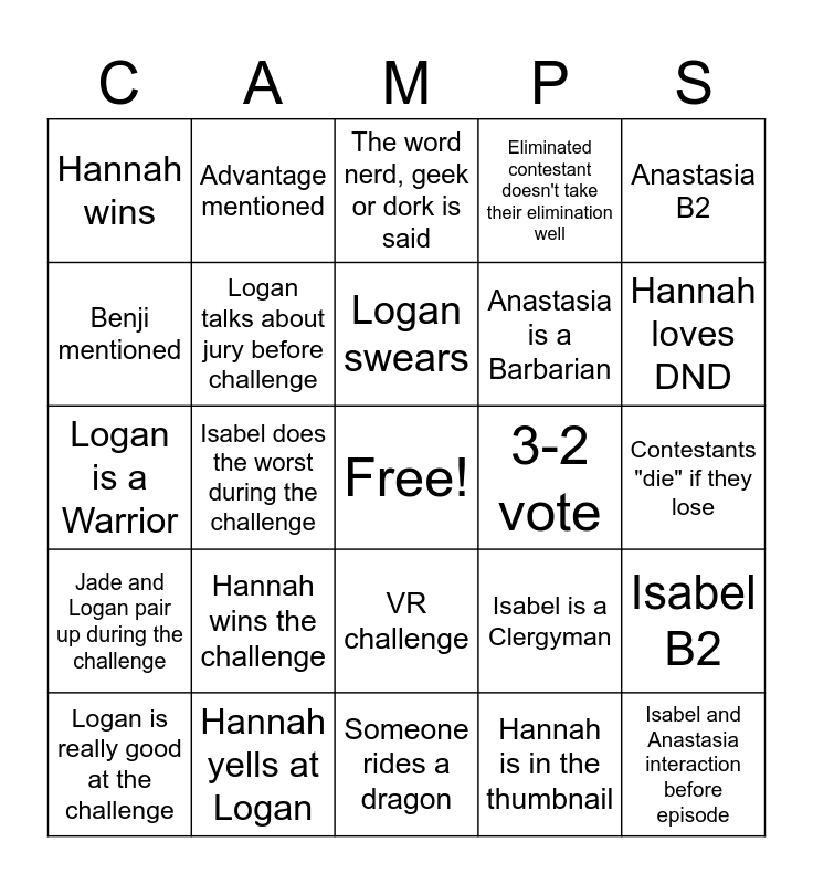 This bingo card has a free space and 24 words: Hannah wins the challenge, Hannah yells at Logan, Logan swears, Logan is really good at the challenge, Anastasia B2, Hannah wins, Benji mentioned, Advantage mentioned, 3-2 vote, VR challenge, Anastasia is a Barbarian, Logan is a Warrior, Isabel is a Clergyman, Isabel B2, Logan talks about jury before challenge, Hannah is in the thumbnail, Contestants "die" if they lose, The word nerd, geek or dork is said, Hannah loves DND, Isabel does the worst during the challenge, Isabel and Anastasia interaction before episode, Jade and Logan pair up during the challenge, Eliminated contestant doesn't take their elimination well and Someone rides a dragon.