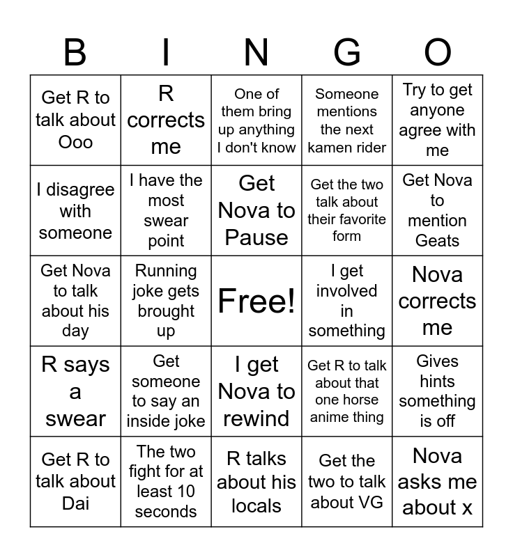 This bingo card has a free space and 24 words: Get someone to say an inside joke, The two fight for at least 10 seconds, Get Nova to Pause, Get R to talk about Dai, Try to get anyone agree with me, Get R to talk about Ooo, I disagree with someone, R corrects me, I get involved in something, I get Nova to rewind, Get the two talk about their favorite form, Get Nova to talk about his day, Get R to talk about that one horse anime thing, Gives hints something is off, I have the most swear point, Get the two to talk about VG, Nova corrects me, One of them bring up anything I don't know, Get Nova to mention Geats, Running joke gets brought up, Nova asks me about x, R says a swear, Someone mentions the next kamen rider and R talks about his locals.