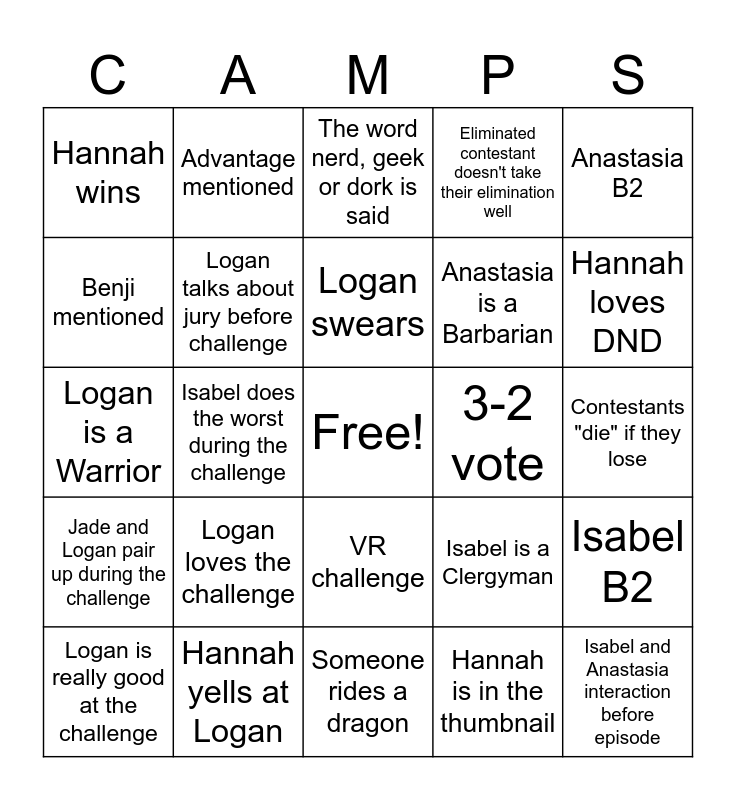 This bingo card has a free space and 24 words: Logan loves the challenge, Hannah yells at Logan, Logan swears, Logan is really good at the challenge, Anastasia B2, Hannah wins, Benji mentioned, Advantage mentioned, 3-2 vote, VR challenge, Anastasia is a Barbarian, Logan is a Warrior, Isabel is a Clergyman, Isabel B2, Logan talks about jury before challenge, Hannah is in the thumbnail, Contestants "die" if they lose, The word nerd, geek or dork is said, Hannah loves DND, Isabel does the worst during the challenge, Isabel and Anastasia interaction before episode, Jade and Logan pair up during the challenge, Eliminated contestant doesn't take their elimination well and Someone rides a dragon.