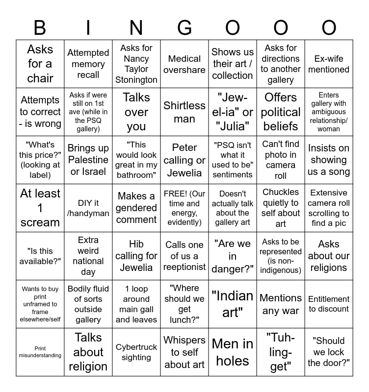 This bingo card has a free space and 48 words: "Indian art", Offers political beliefs, Whispers to self about art, DIY it /handyman, "This would look great in my bathroom", Extensive camera roll scrolling to find a pic, Attempted memory recall, Talks about religion, Asks for directions to another gallery, Calls one of us a reeptionist, Ex-wife mentioned, Medical overshare, Can't find photo in camera roll, "PSQ isn't what it used to be" sentiments, Wants to buy print unframed to frame elsewhere/self, Chuckles quietly to self about art, Attempts to correct - is wrong, Enters gallery with ambiguous relationship/ woman, Mentions any war, Shows us their art / collection, "Jew-el-ia" or "Julia", Makes a gendered comment, Asks for a chair, Asks if were still on 1st ave (while in the PSQ gallery), Entitlement to discount, Talks over you, Insists on showing us a song, Print misunderstanding, Peter calling or Jewelia, Brings up Palestine or Israel, "Tuh-ling-get", Doesn't actually talk about the gallery art, Asks about our religions, Bodily fluid of sorts outside gallery, At least 1 scream, "Are we in danger?", Asks to be represented (is non-indigenous), "What's this price?" (looking at label), Hib calling for Jewelia, 1 loop around main gall and leaves, "Is this available?", "Should we lock the door?", Asks for Nancy Taylor Stonington, Cybertruck sighting, Shirtless man, "Where should we get lunch?", Extra weird national day and Men in holes.