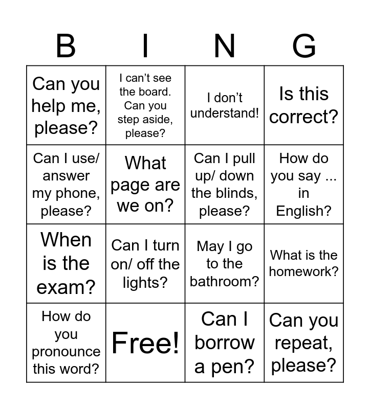 This bingo card has 21 words: Free!, I have a question., I can’t see the board. Can you step aside, please?, May I come in?, Can I borrow a pen?, Can I pull up/ down the blinds, please?, Can you help me, please?, I don’t understand!, May I go to the bathroom?, How do you say ... in English?, When is the exam?, Is this correct?, Can you repeat, please?, What does .... mean?, What page are we on?, How do you spell____?, How do you pronounce this word?, Can I turn on/ off the lights?, Can I use/ answer my phone, please?, What is the homework? and Can I answer the question?.