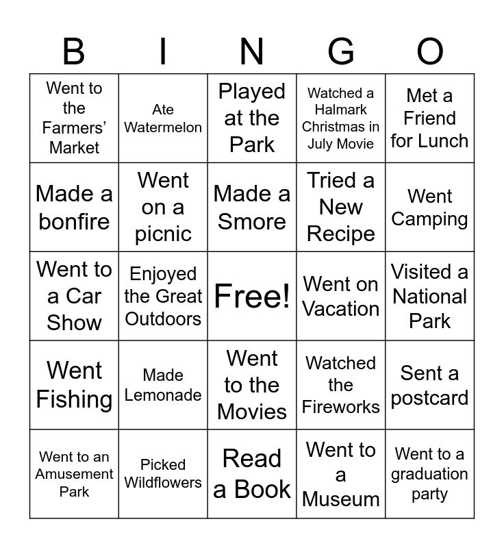 This bingo card has a free space and 49 words: Watched Shark Week, Went to a graduation party, Went for a Bike Ride, Read a Book, Made Lemonade, Went Swimming, Ate Watermelon, Went to the beach, Made a bonfire, Watched the Sunset, Went on a picnic, Watched a Halmark Christmas in July Movie, Sent a postcard, Watched the Fireworks, Built a sandcastle, Labor day, Made a Smore, Went on Vacation, Went to visit Family, Met a Friend for Lunch, Enjoyed the Great Outdoors, Went to a Museum, Went to the Farmers’ Market, Tried a New Recipe, Flew a Kite, Went Camping, Went to an Amusement Park, Found a new Hobby, Went to the Movies, Went Fishing, Bought a Lottery Ticket, Took a Nap on a Hammock, Watched a thunderstorm, Played Cornhole, Picked Wildflowers, Roasted Marshmallows, Had Family Game Night, Had a Cookout, Visited a National Park, Went to the Lake, Went to a Concert, Ate shaved ice, Went to a baseball game, Ate at a food truck, Went to a Car Show, Played at the Park, Bought a new swimsuit, Went to a carnival or state fair and Waited patiently for fall to arrive.