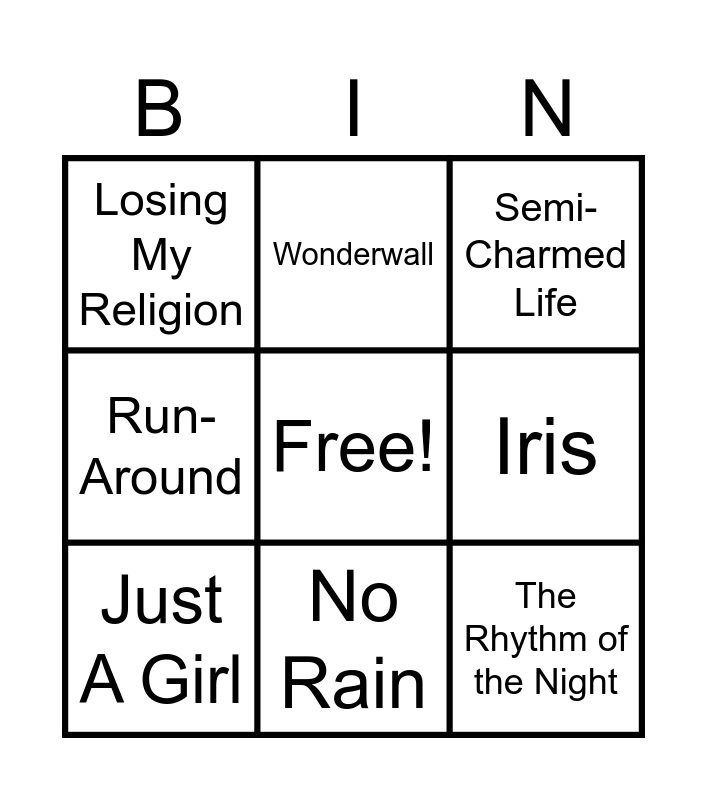 This bingo card has a free space and 9 words: Just A Girl, Semi-Charmed Life, Wonderwall, Run-Around, Losing My Religion, Iris, The Rhythm of the Night, Lovefool and No Rain.