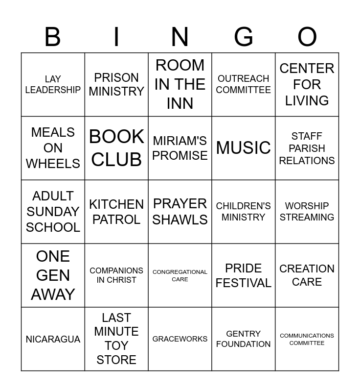 This bingo card has 35 words: YOUTH MINISTRY, FAMILY FALL RETREAT, WELCOME COMMITTEE, BOOK CLUB, CONGREGATIONAL CARE, OUTREACH COMMITTEE, MEALS ON WHEELS, USHERS, MIRIAM'S PROMISE, HABITAT, ADULT SUNDAY SCHOOL, CENTER FOR LIVING, UWF, TRUSTEES, LAY LEADERSHIP, CHILDREN'S MINISTRY, GENTRY FOUNDATION, KITCHEN PATROL, ONE GEN AWAY, PRAYER SHAWLS, PRIDE FESTIVAL, NICARAGUA, CREATION CARE, LAST MINUTE TOY STORE, ROOM IN THE INN, STAFF PARISH RELATIONS, COMMUNICATIONS COMMITTEE, JOY CLUB, MUSIC, WORSHIP STREAMING, GLENCLIFF UMC, GRACEWORKS, COMPANIONS IN CHRIST, PRISON MINISTRY and RAISE THE ROOF.