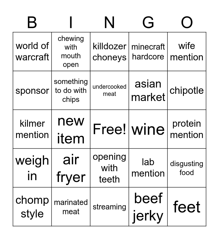This bingo card has a free space and 24 words: air fryer, marinated meat, undercooked meat, chomp style, wife mention, world of warcraft, sponsor, chewing with mouth open, wine, opening with teeth, asian market, kilmer mention, lab mention, disgusting food, something to do with chips, beef jerky, protein mention, killdozer choneys, chipotle, new item, feet, weigh in, minecraft hardcore and streaming.