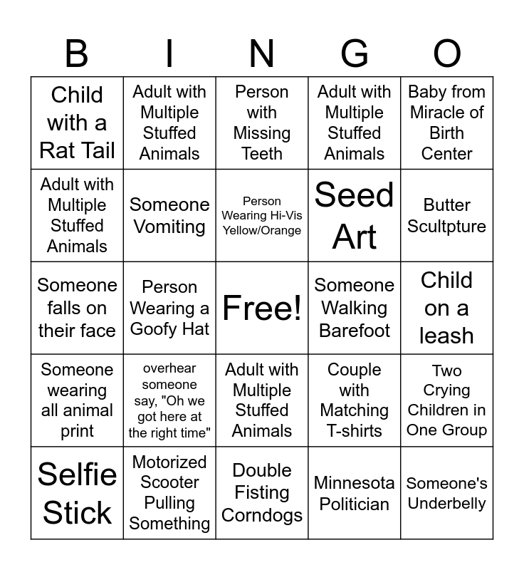 This bingo card has a free space and 29 words: Adult with Multiple Stuffed Animals, Motorized Scooter Pulling Something, Person with Missing Teeth, Someone you know outside of our group, Baby from Miracle of Birth Center, Child with a Rat Tail, Someone Vomiting, Person Wearing Hi-Vis Yellow/Orange, Someone Walking Barefoot, Two Crying Children in One Group, Selfie Stick, Person Wearing a Goofy Hat, Minnesota Politician, Someone's Underbelly, Someone falls on their face, Exposed Underwear/Plumbers Crack, Double Fisting Corndogs, Couple with Matching T-shirts, Butter Scultpture, Someone wearing all animal print, overhear someone say, "Oh we got here at the right time", Pro-Trump T-shirt, Seed Art, Child on a leash, Adult with Multiple Stuffed Animals, Adult with Multiple Stuffed Animals, Adult with Multiple Stuffed Animals, Adult with Multiple Stuffed Animals and Adult with Multiple Stuffed Animals.
