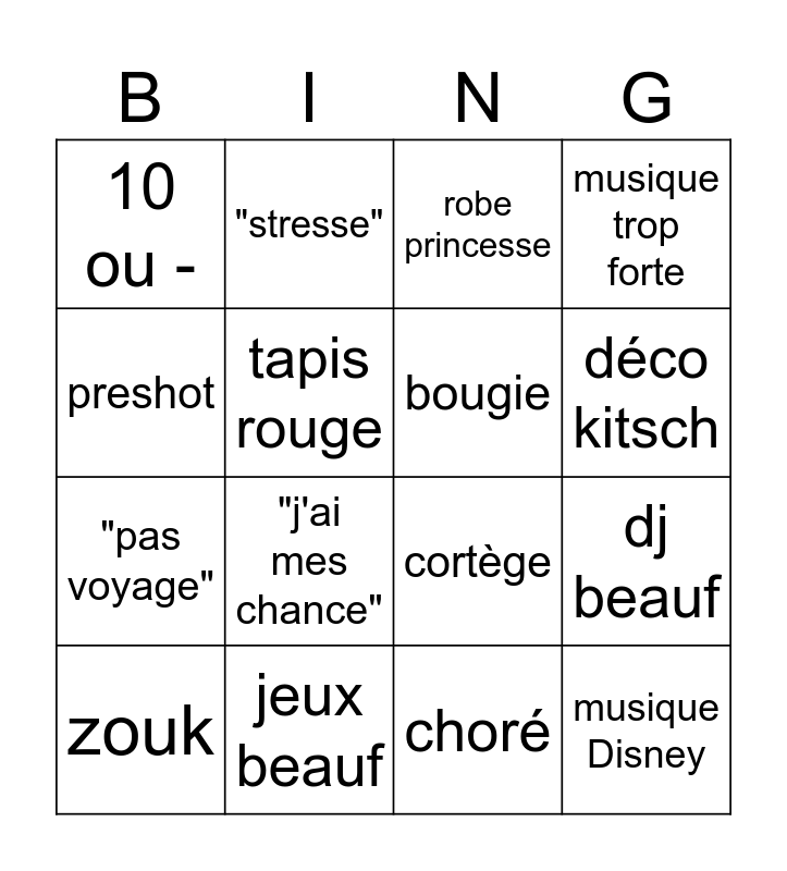 This bingo card has 16 words: jeux beauf, dj beauf, robe princesse, 10 ou -, "pas voyage", "stresse", cortège, choré, preshot, tapis rouge, zouk, musique trop forte, "j'ai mes chance", déco kitsch, bougie and musique Disney.
