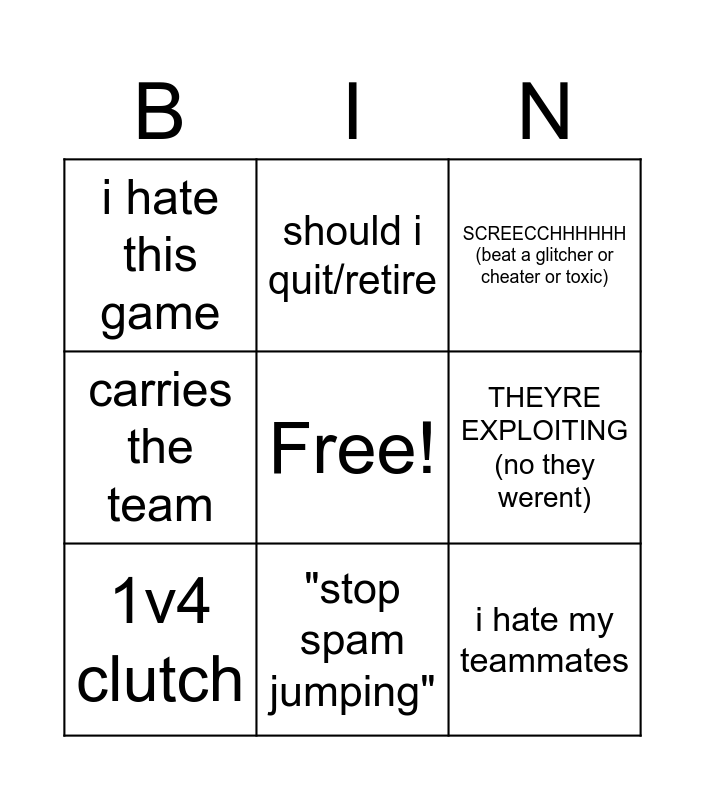 This bingo card has a free space and 8 words: THEYRE EXPLOITING (no they werent), SCREECCHHHHHH (beat a glitcher or cheater or toxic), should i quit/retire, 1v4 clutch, i hate this game, i hate my teammates, carries the team and "stop spam jumping".