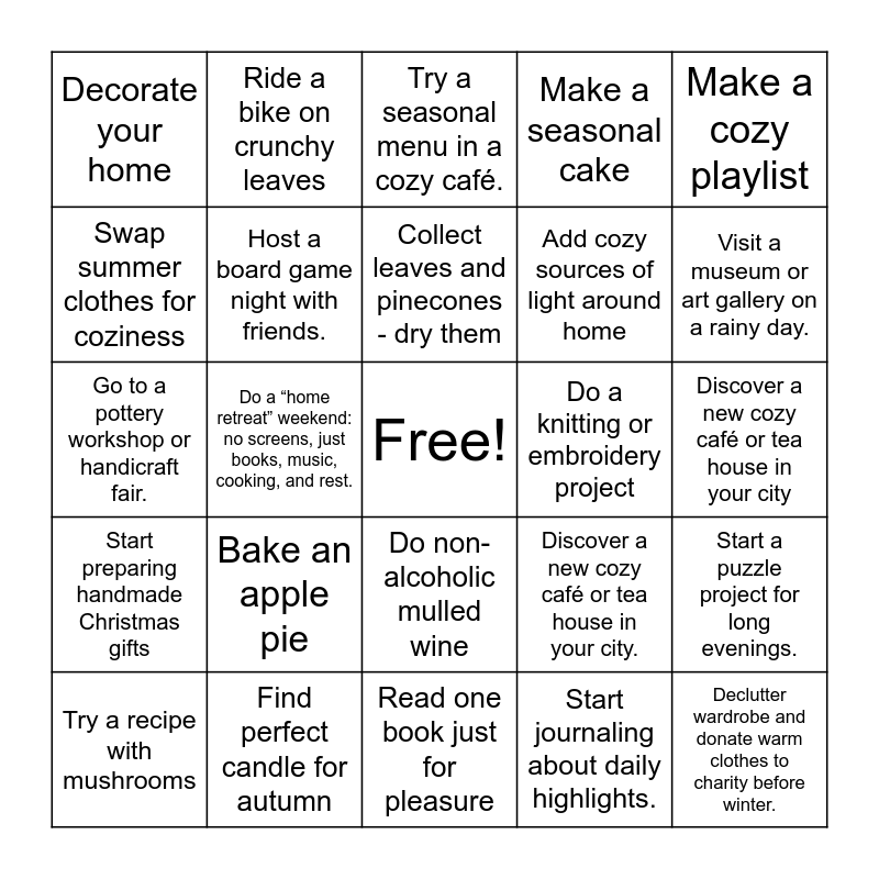 This bingo card has a free space and 24 words: Bake an apple pie, Find perfect candle for autumn, Collect leaves and pinecones - dry them, Try a recipe with mushrooms, Make a cozy playlist, Decorate your home, Swap summer clothes for coziness, Ride a bike on crunchy leaves, Do a knitting or embroidery project, Do non-alcoholic mulled wine, Add cozy sources of light around home, Go to a pottery workshop or handicraft fair., Discover a new cozy café or tea house in your city., Start a puzzle project for long evenings., Host a board game night with friends., Start journaling about daily highlights., Discover a new cozy café or tea house in your city, Try a seasonal menu in a cozy café., Visit a museum or art gallery on a rainy day., Do a “home retreat” weekend: no screens, just books, music, cooking, and rest., Declutter wardrobe and donate warm clothes to charity before winter., Start preparing handmade Christmas gifts, Make a seasonal cake and Read one book just for pleasure.