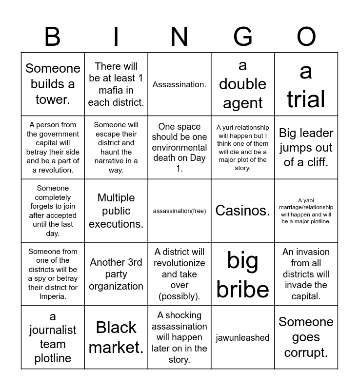 This bingo card has a free space and 25 words: Another 3rd party organization, A shocking assassination will happen later on in the story., One space should be one environmental death on Day 1., a journalist team plotline, a trial, Someone builds a tower., A person from the government capital will betray their side and be a part of a revolution., There will be at least 1 mafia in each district., Casinos., A district will revolutionize and take over (possibly)., A yuri relationship will happen but I think one of them will die and be a major plot of the story., Someone completely forgets to join after accepted until the last day., big bribe, An invasion from all districts will invade the capital., Someone will escape their district and haunt the narrative in a way., Someone will die and shall haunt the narrative., A yaoi marriage/relationship will happen and will be a major plotline., Assassination., Big leader jumps out of a cliff., Multiple public executions., Someone goes corrupt., Black market., Someone from one of the districts will be a spy or betray their district for Imperia., a double agent and jawunleashed.