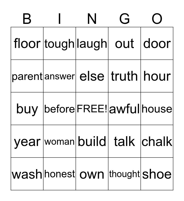 This bingo card has a free space and 24 words: woman, honest, else, wash, door, floor, parent, tough, awful, build, truth, buy, talk, chalk, answer, thought, house, laugh, hour, before, shoe, year, out and own.