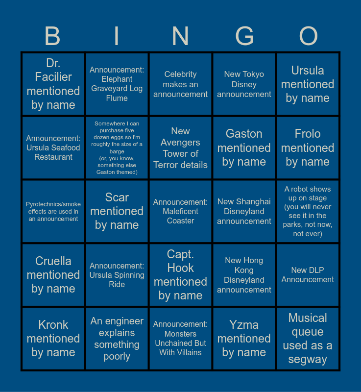This bingo card has 49 words: Announcement: Villains land will have a villain team-up ride, Announcement: Maleficent Coaster, Announcement: Yzma & Kronk Ride, Announcement: Monsters Unchained But With Villains, Announcement: Ursula Spinning Ride, Announcement: Scar Spinning Ride, Announcement: Elephant Graveyard Log Flume, Announcement: Bibbidi Bobbidi Boutique but it's EEEEVILLLLL, Announcement: Ursula Seafood Restaurant, Announcement: Cruella Fashion Boutique, Somewhere I can purchase five dozen eggs so I'm roughly the size of a barge (or, you know, something else Gaston themed), New Tokyo Disney announcement, New DLP Announcement, New Hong Kong Disneyland announcement, HKDL Spiderman Coaster construction update, New Lion King Splash Mountain details, New Avengers Tower of Terror details, New Shanghai Disneyland announcement, Disney Abu Dhabi is mentioned, like, at all, Ursula mentioned by name, Scar mentioned by name, Yzma mentioned by name, Dr. Facilier mentioned by name, Gaston mentioned by name, Maleficent mentioned by name, Frolo mentioned by name, Kronk mentioned by name, Hades mentioned by name, Capt. Hook mentioned by name, Cruella mentioned by name, Evil Queen mentioned (bonus points if you actually know what her name is), Chernabog mentioned, Mother Gothel mentioned, The Magic Mirror appears, An engineer explains something poorly, A new cruise ship is named or art is shared, An engineer is on stage and has zero charisma, Details about the Disney/Epic Games partnership, A robot shows up on stage (you will never see it in the parks, not now, not ever), Bob Iger is on stage, A character "hijacks" the event, New character meet and greet announced, Musical queue used as a segway, Obligatory musical number, Pyrotechnics/smoke effects are used in an announcement, Celebrity makes an announcement, Cut away to a celebrity's reaction in the crowd, Giveaway to people in the audience and Why is/are the Three Caballeros panel(s) like this?.
