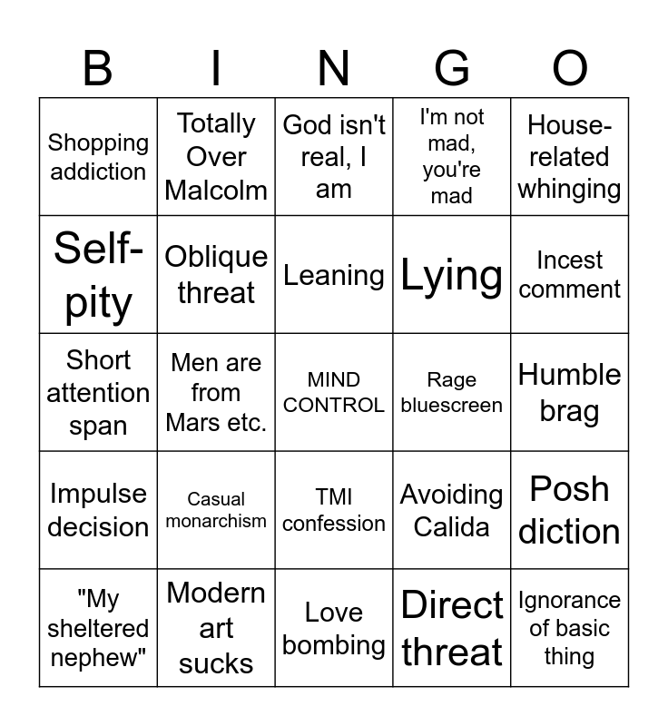 This bingo card has a free space and 24 words: Casual monarchism, Modern art sucks, Leaning, "My sheltered nephew", House- related whinging, Shopping addiction, Self-pity, Totally Over Malcolm, Rage bluescreen, TMI confession, Lying, Short attention span, Avoiding Calida, Posh diction, Oblique threat, Direct threat, Humble brag, God isn't real, I am, Incest comment, Men are from Mars etc., Ignorance of basic thing, Impulse decision, I'm not mad, you're mad and Love bombing.