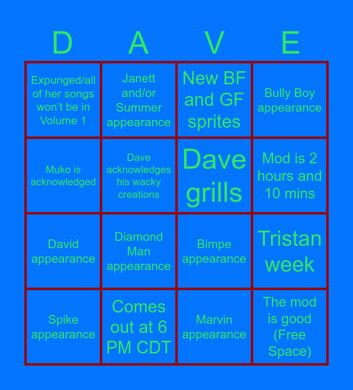 This bingo card has 16 words: Comes out at 6 PM CDT, Tristan week, New BF and GF sprites, Expunged/all of her songs won’t be in Volume 1, David appearance, Janett and/or Summer appearance, Bimpe appearance, Marvin appearance, Muko is acknowledged, Dave acknowledges his wacky creations, Spike appearance, Bully Boy appearance, Diamond Man appearance, Mod is 2 hours and 10 mins, Dave grills and The mod is good (Free Space).