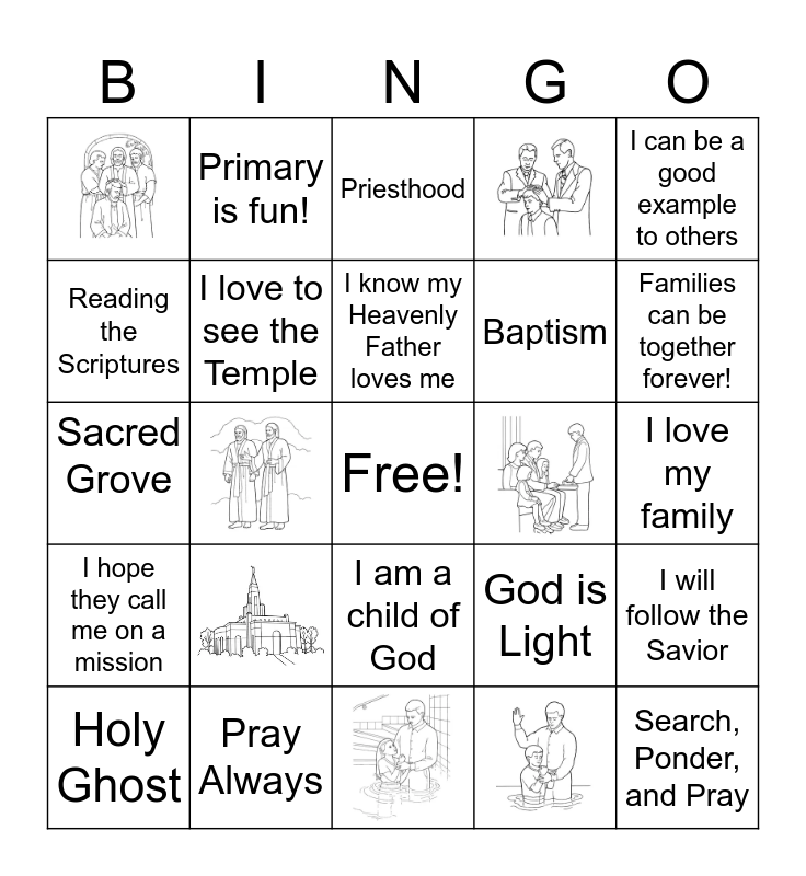 This bingo card has 10 images, a free space and 19 words: Holy Ghost, Priesthood, I love to see the Temple, Pray Always, I love my family, Search, Ponder, and Pray, Families can be together forever!, Jesus wants me for a Sunbeam, I am a child of God, I hope they call me on a mission, I can be a good example to others, Sacred Grove, God is Light, Follow the Prophet, Baptism, Reading the Scriptures, Primary is fun!, I will follow the Savior and I know my Heavenly Father loves me.