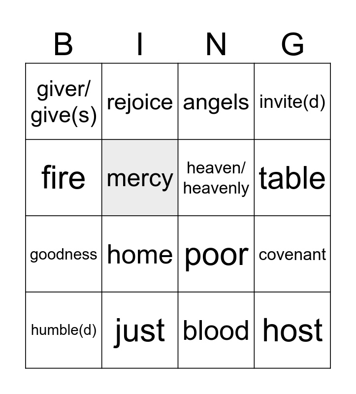 This bingo card has 16 words: humble(d), just, angels, invite(d), fire, rejoice, poor, covenant, giver/ give(s), mercy, blood, table, goodness, home, heaven/ heavenly and host.