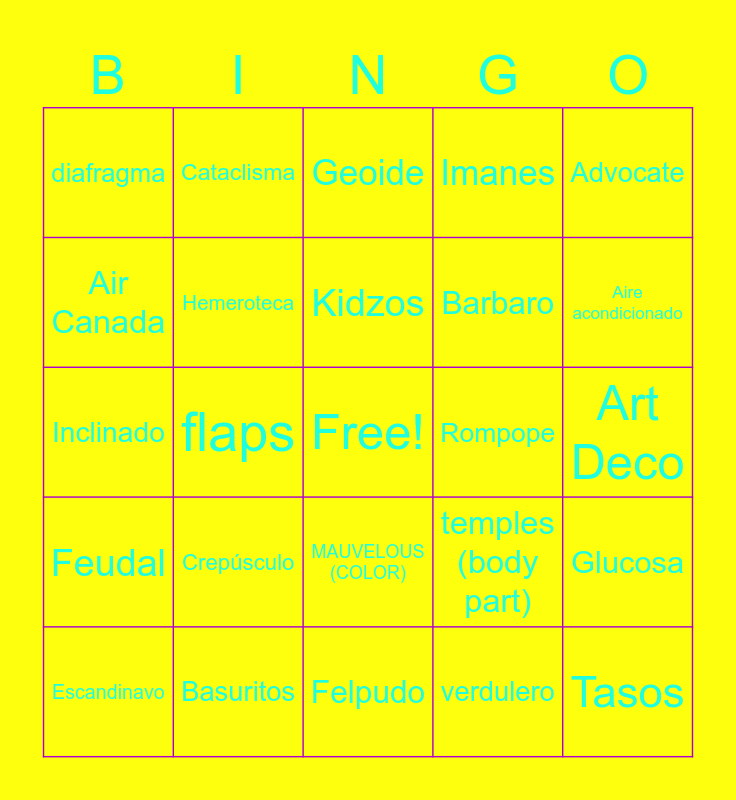 This bingo card has a free space and 24 words: Crepúsculo, Basuritos, Kidzos, Escandinavo, Advocate, diafragma, Air Canada, Cataclisma, Rompope, MAUVELOUS (COLOR), Barbaro, Inclinado, temples (body part), Glucosa, Hemeroteca, verdulero, Art Deco, Geoide, Aire acondicionado, flaps, Tasos, Feudal, Imanes and Felpudo.