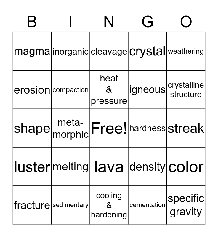 This bingo card has a free space and 24 words: melting, sedimentary, heat & pressure, fracture, weathering, magma, erosion, inorganic, hardness, lava, igneous, shape, density, color, compaction, cementation, streak, cleavage, crystalline structure, meta-morphic, specific gravity, luster, crystal and cooling & hardening.