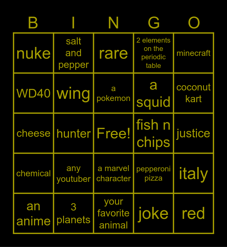 This bingo card has a free space and 24 words: any youtuber, 3 planets, a pokemon, an anime, minecraft, nuke, WD40, salt and pepper, fish n chips, a marvel character, a squid, cheese, pepperoni pizza, italy, wing, joke, justice, rare, coconut kart, hunter, red, chemical, 2 elements on the periodic table and your favorite animal.