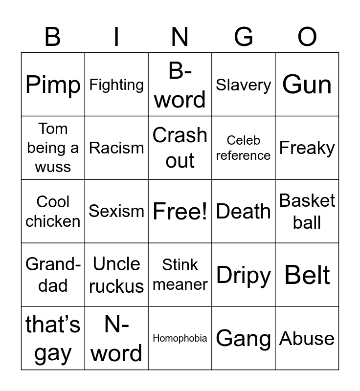 This bingo card has a free space and 24 words: Uncle ruckus, N-word, Crash out, that’s gay, Gun, Pimp, Tom being a wuss, Fighting, Death, Stink meaner, Celeb reference, Cool chicken, Dripy, Belt, Racism, Gang, Basket ball, B-word, Freaky, Sexism, Abuse, Grand-dad, Slavery and Homophobia.
