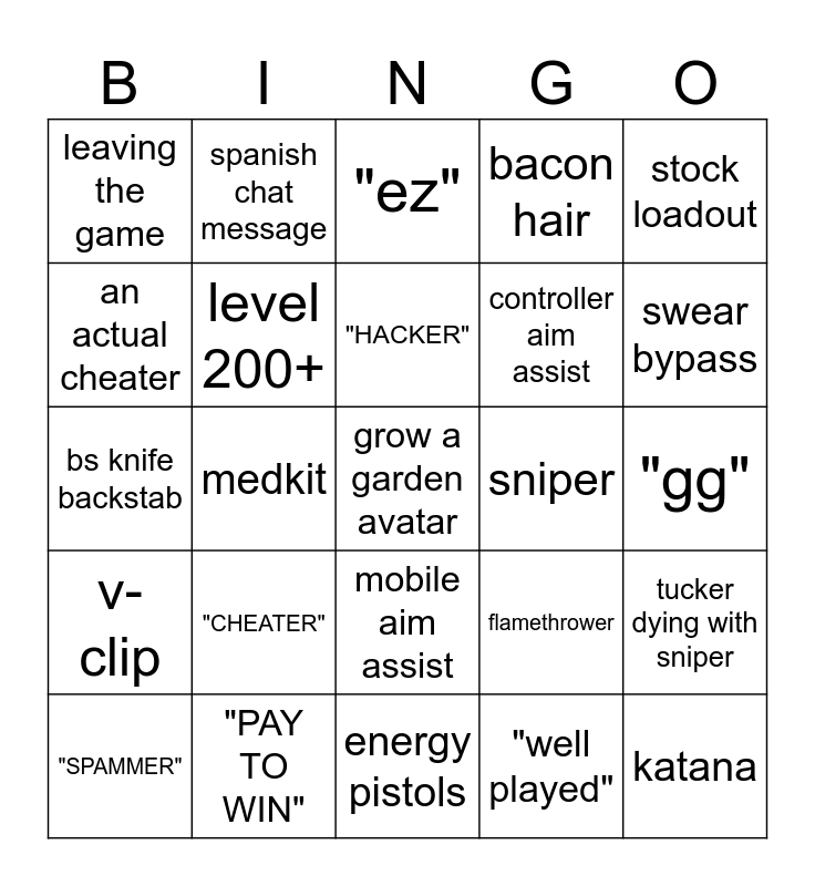 This bingo card has a free space and 24 words: "CHEATER", "PAY TO WIN", "HACKER", "SPAMMER", stock loadout, leaving the game, an actual cheater, spanish chat message, sniper, mobile aim assist, controller aim assist, bs knife backstab, flamethrower, tucker dying with sniper, level 200+, "well played", "gg", "ez", swear bypass, medkit, katana, v-clip, bacon hair and energy pistols.