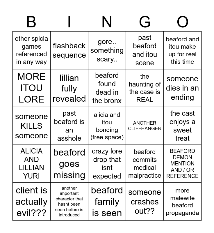 This bingo card has a free space and 24 words: beaford goes missing, another important character that hasnt been seen before is introduced, beaford found dead in the bronx, client is actually evil???, beaford and itou make up for real this time, other spicia games referenced in any way, MORE ITOU LORE, flashback sequence, ANOTHER CLIFFHANGER, crazy lore drop that isnt expected, the haunting of the case is REAL, someone KILLS someone, beaford commits medical malpractice, BEAFORD DEMON MENTION AND / OR REFERENCE, lillian fully revealed, someone crashes out??, the cast enjoys a sweet treat, gore.. something scary.., someone dies in an ending, past beaford is an asshole, more malewife beaford propaganda, ALICIA AND LILLIAN YURI, past beaford and itou scene and beaford family is seen.